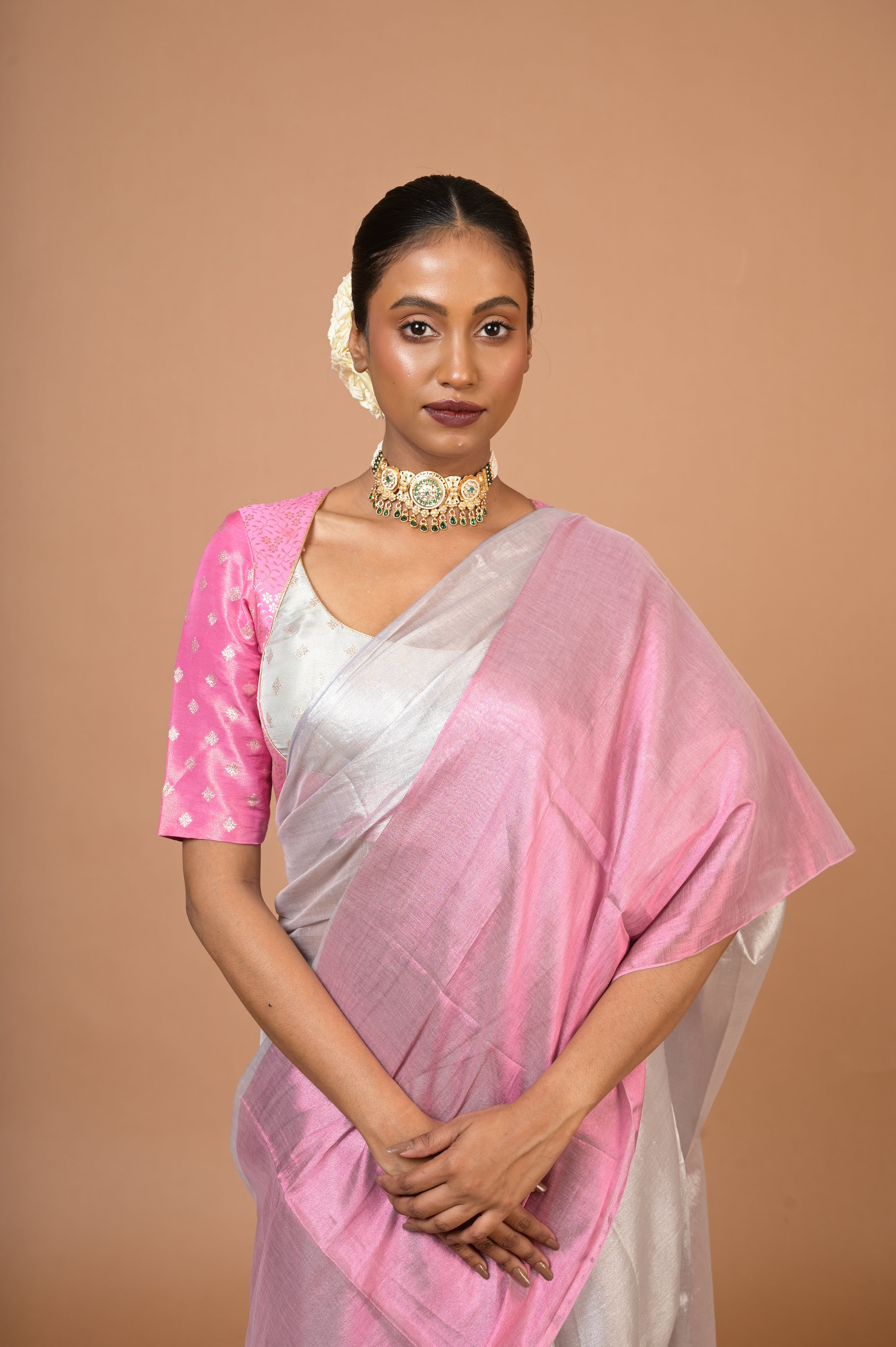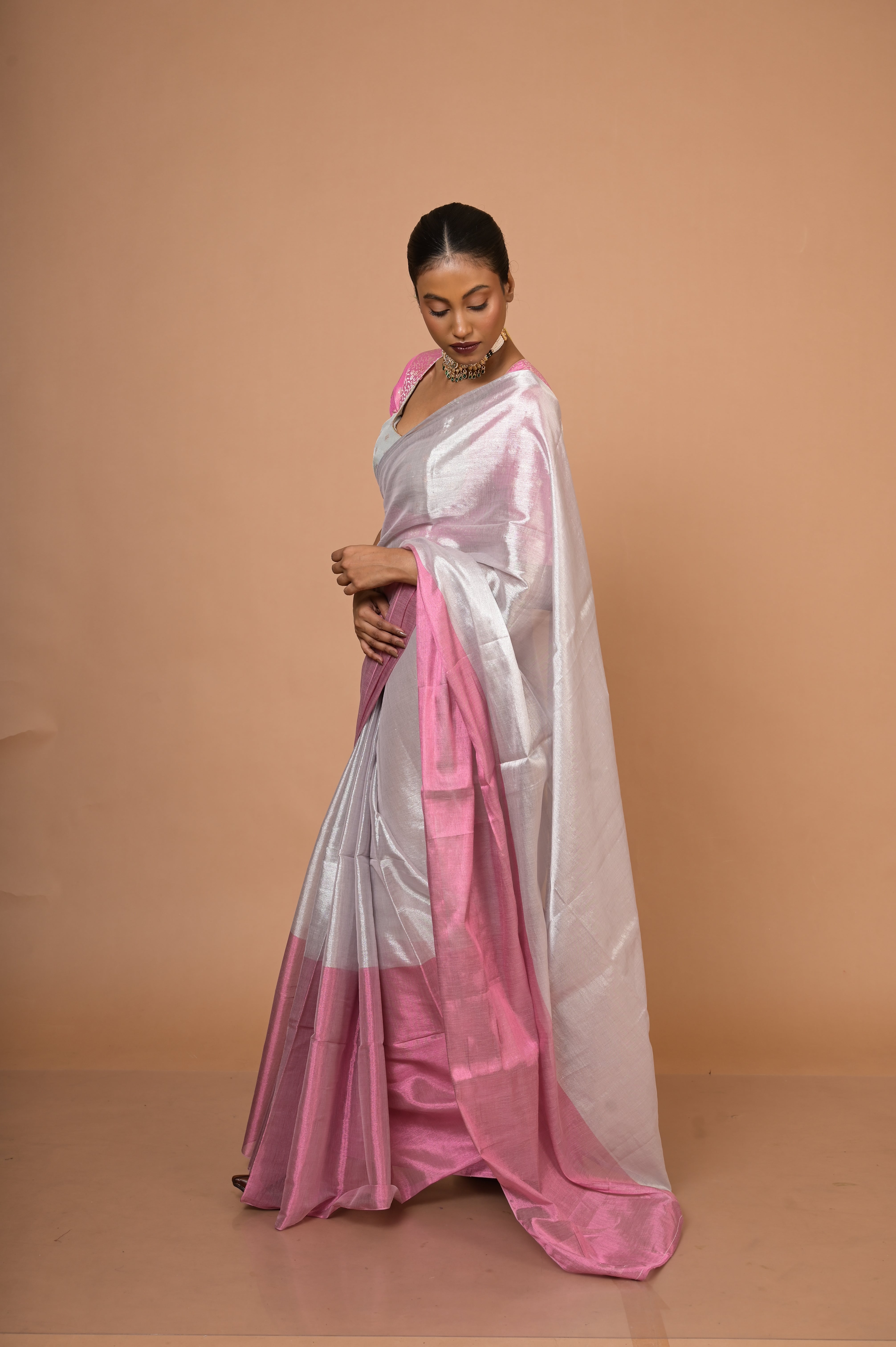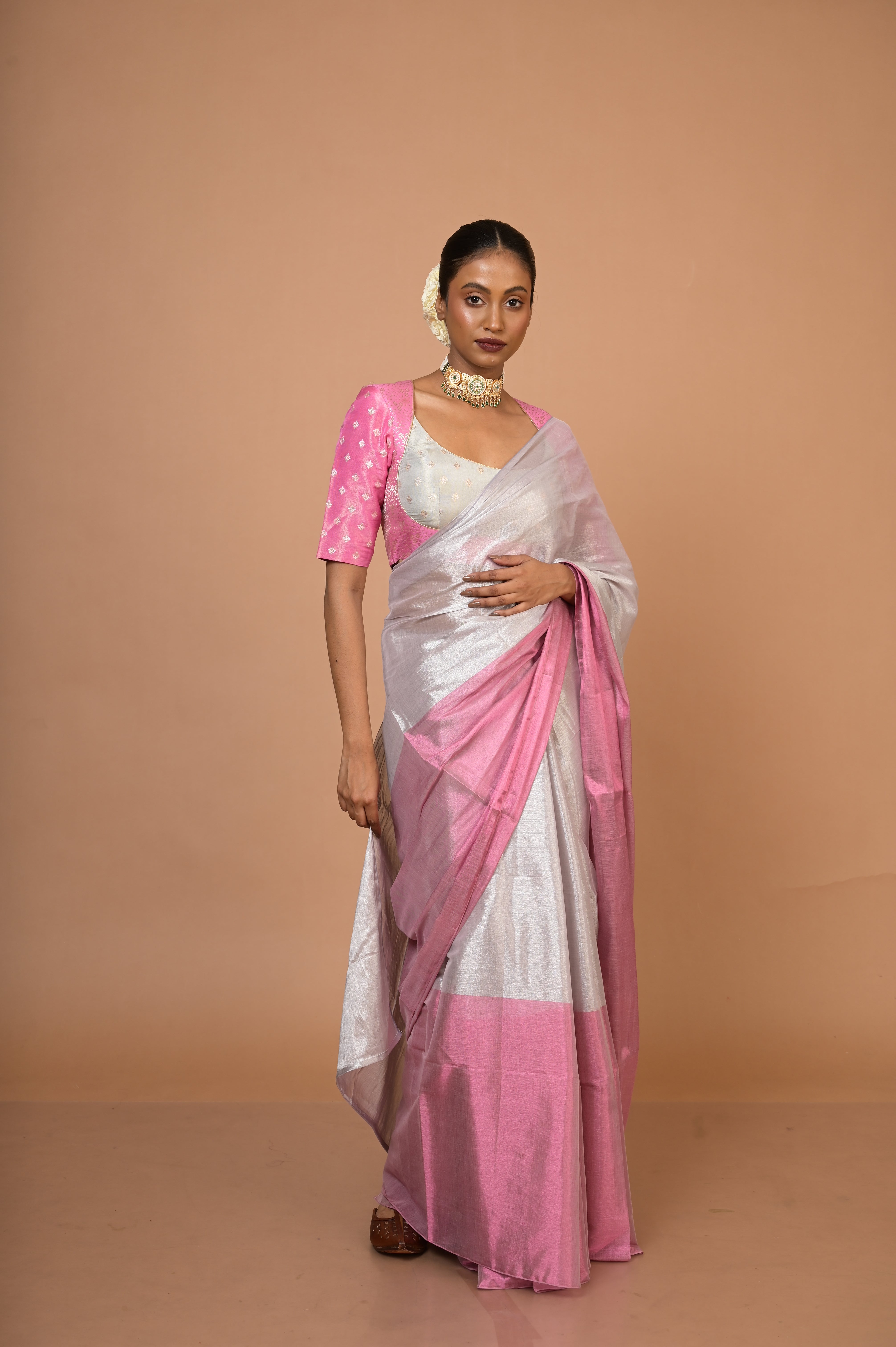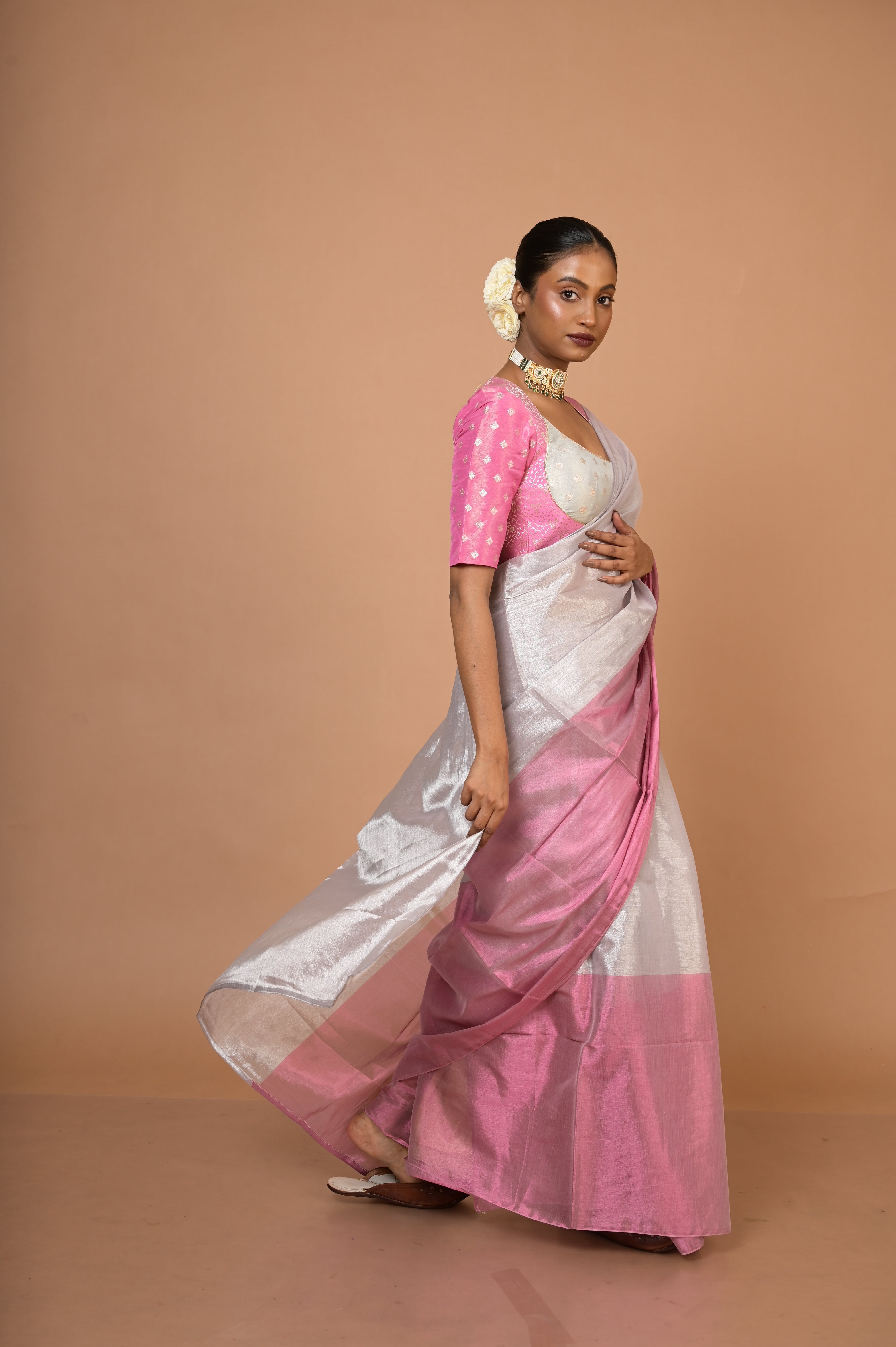 A stunning blend of tradition and elegance, this handwoven silver and pink tissue saree is a true masterpiece. Crafted with delicate precision over two days, the sheer, luminous fabric drapes effortlessly, reflecting a mesmerizing interplay of colours. The rich silver body is gracefully contrasted by the vibrant pink border , creating a striking yet harmonious look. Light, airy, and effortlessly regal, this saree is a perfect choice for festive occasions, celebrations, and timeless grace.