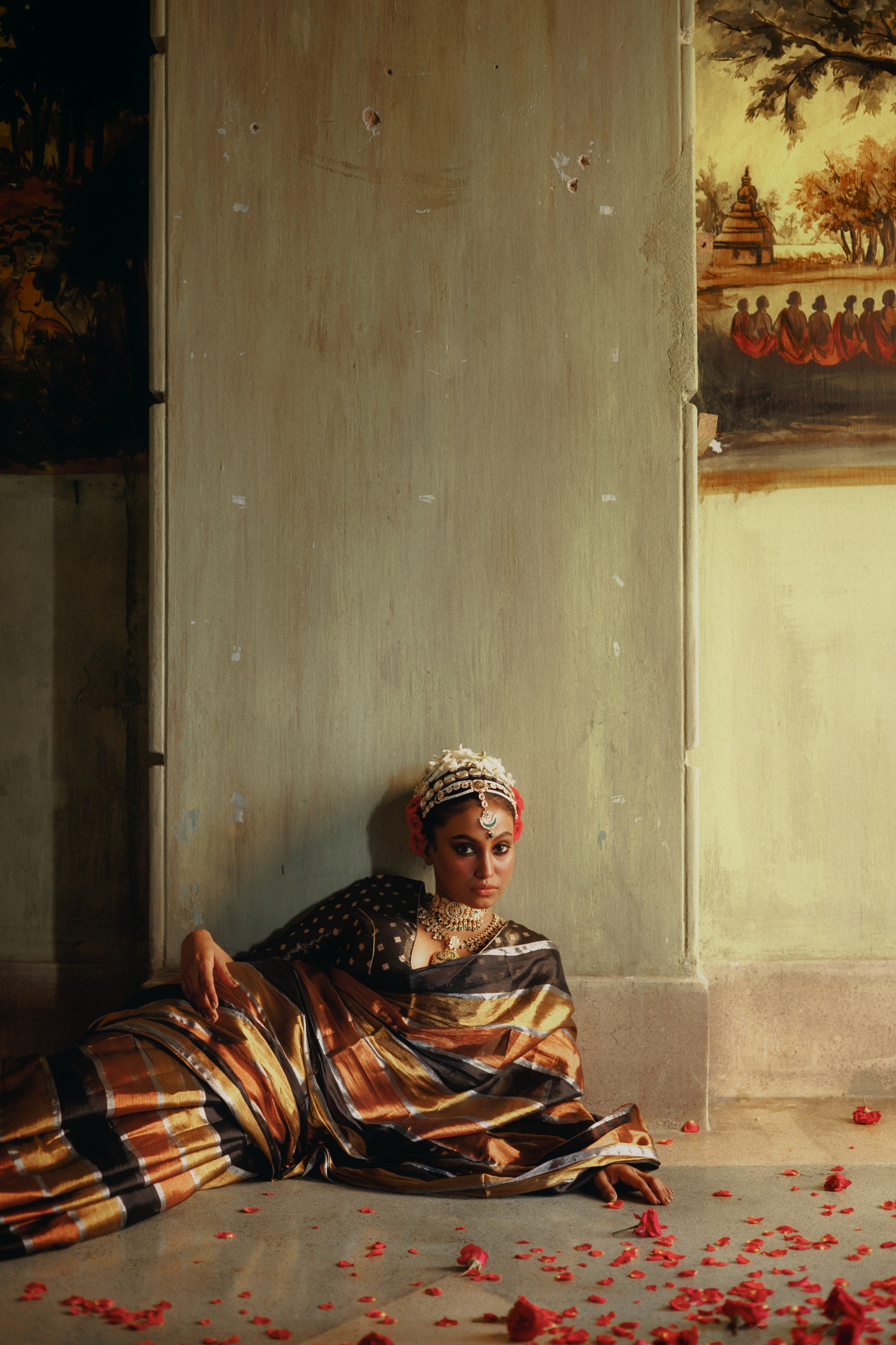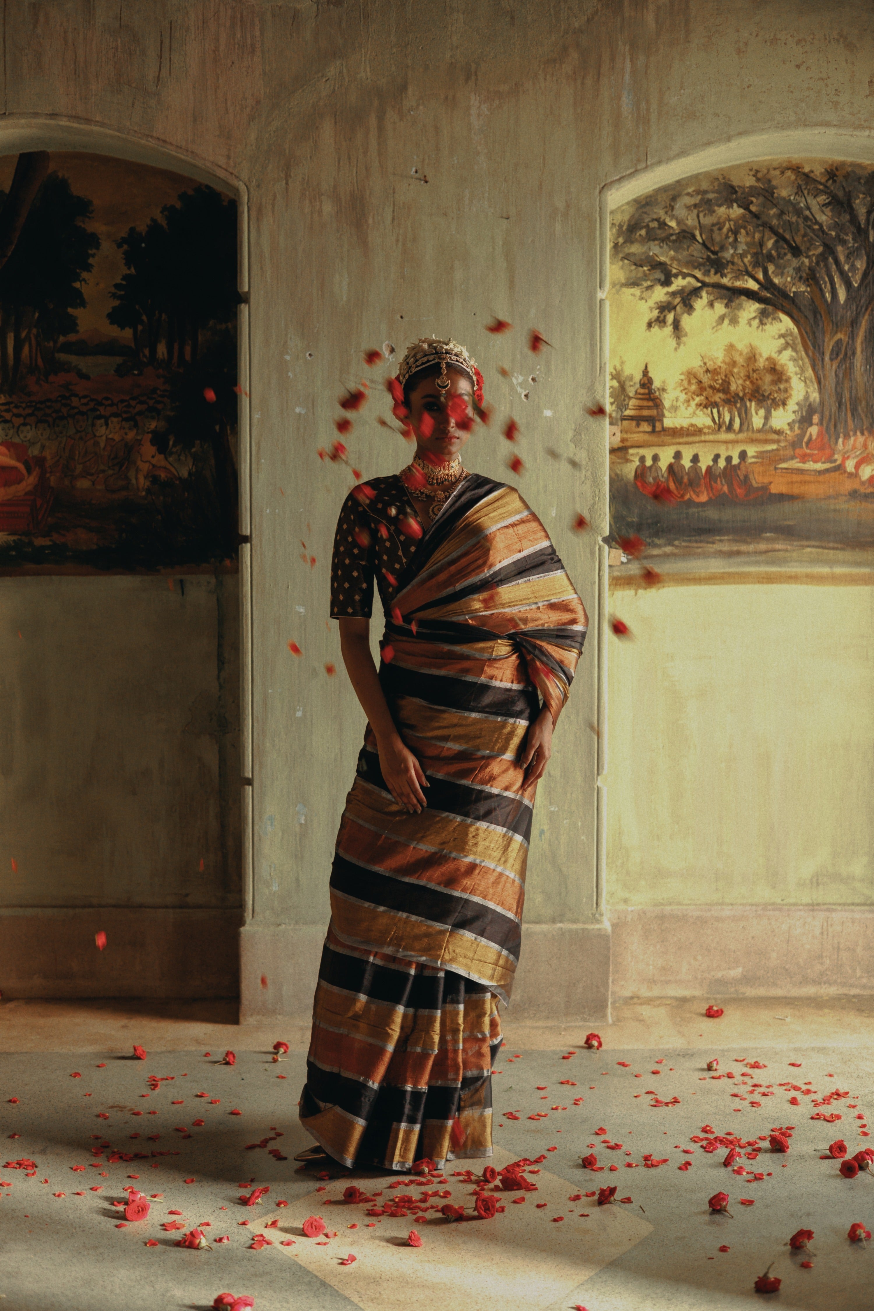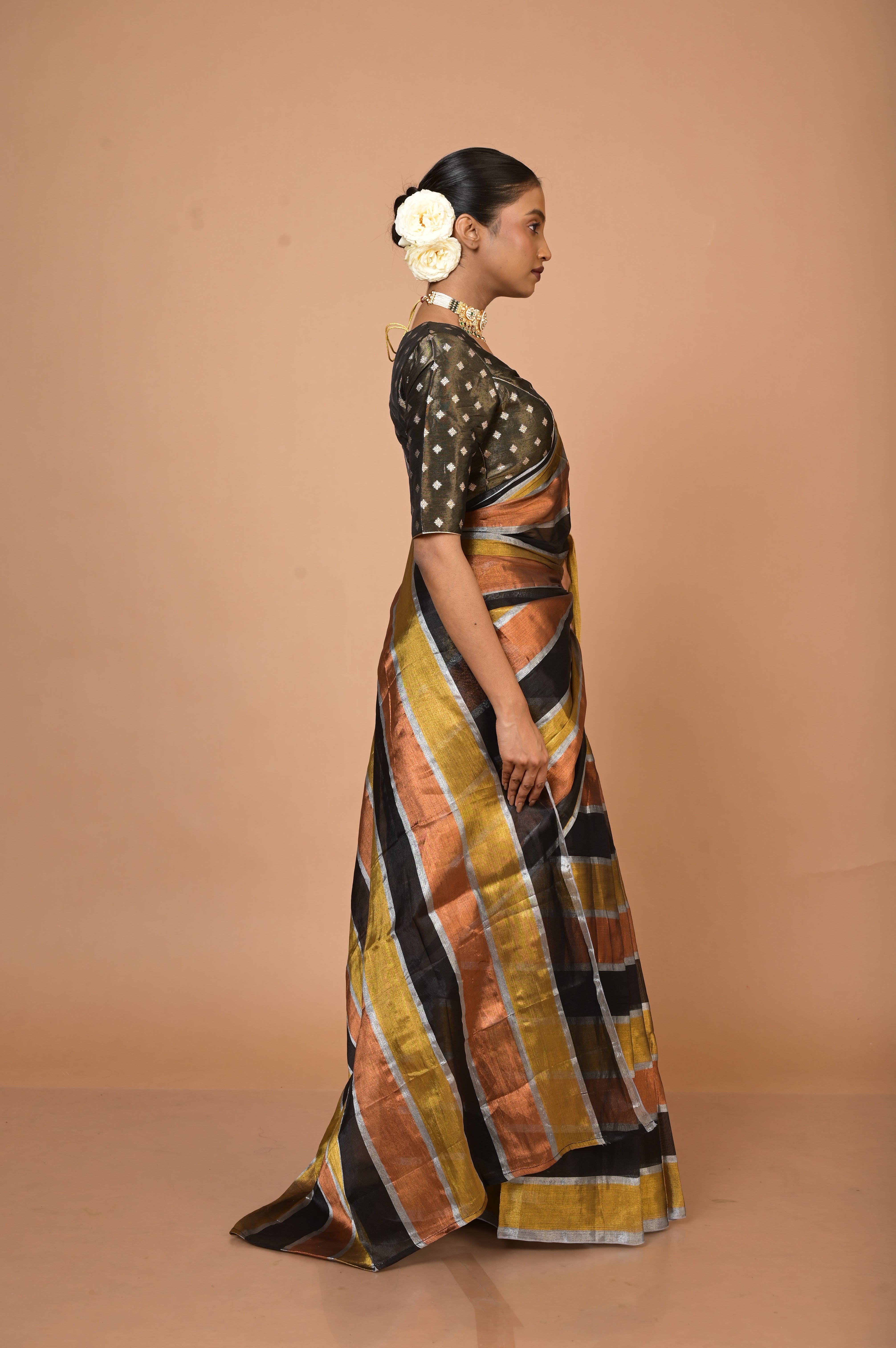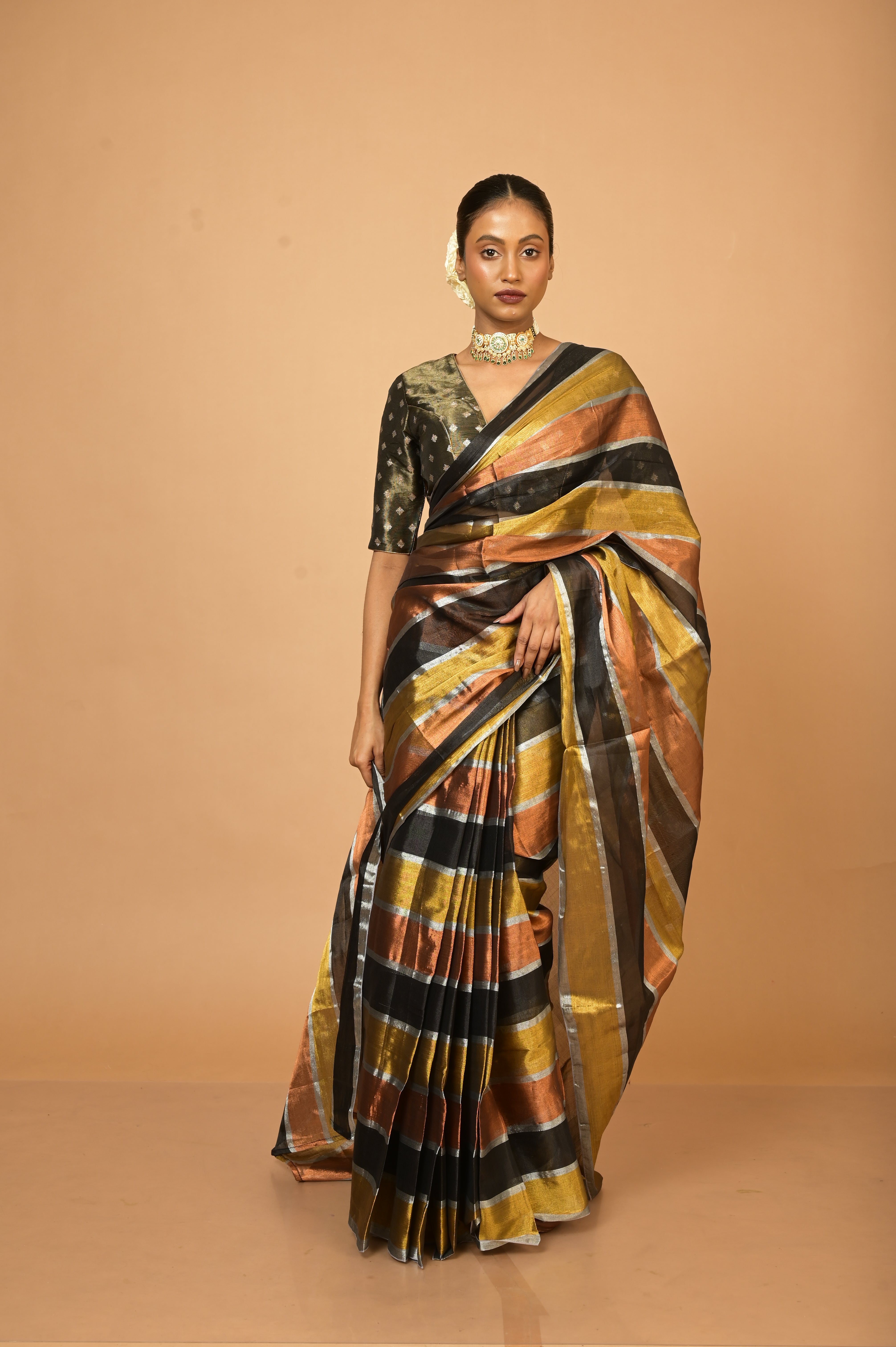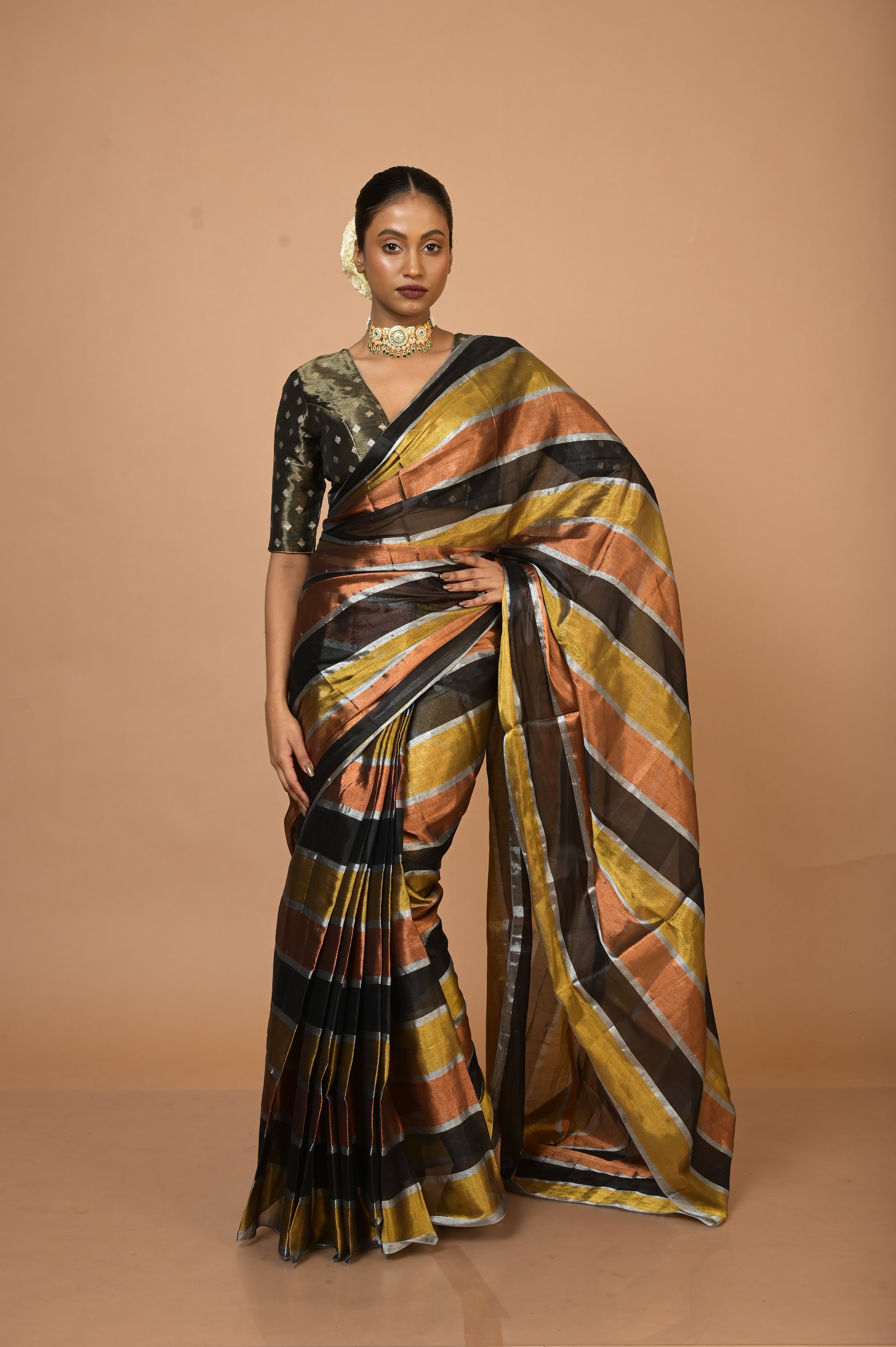 This handwoven multicolored tissue saree blends luxury and elegance. Crafted from premium tissue fabric, it drapes beautifully and offers a sophisticated look. The intricate handwoven craftsmanship ensures a unique touch, taking two days to make. The rich golden hue adds a touch of opulence, while the bold black and warm copper create a striking contrast. Perfect for any occasions, this saree combines traditional charm with modern style.